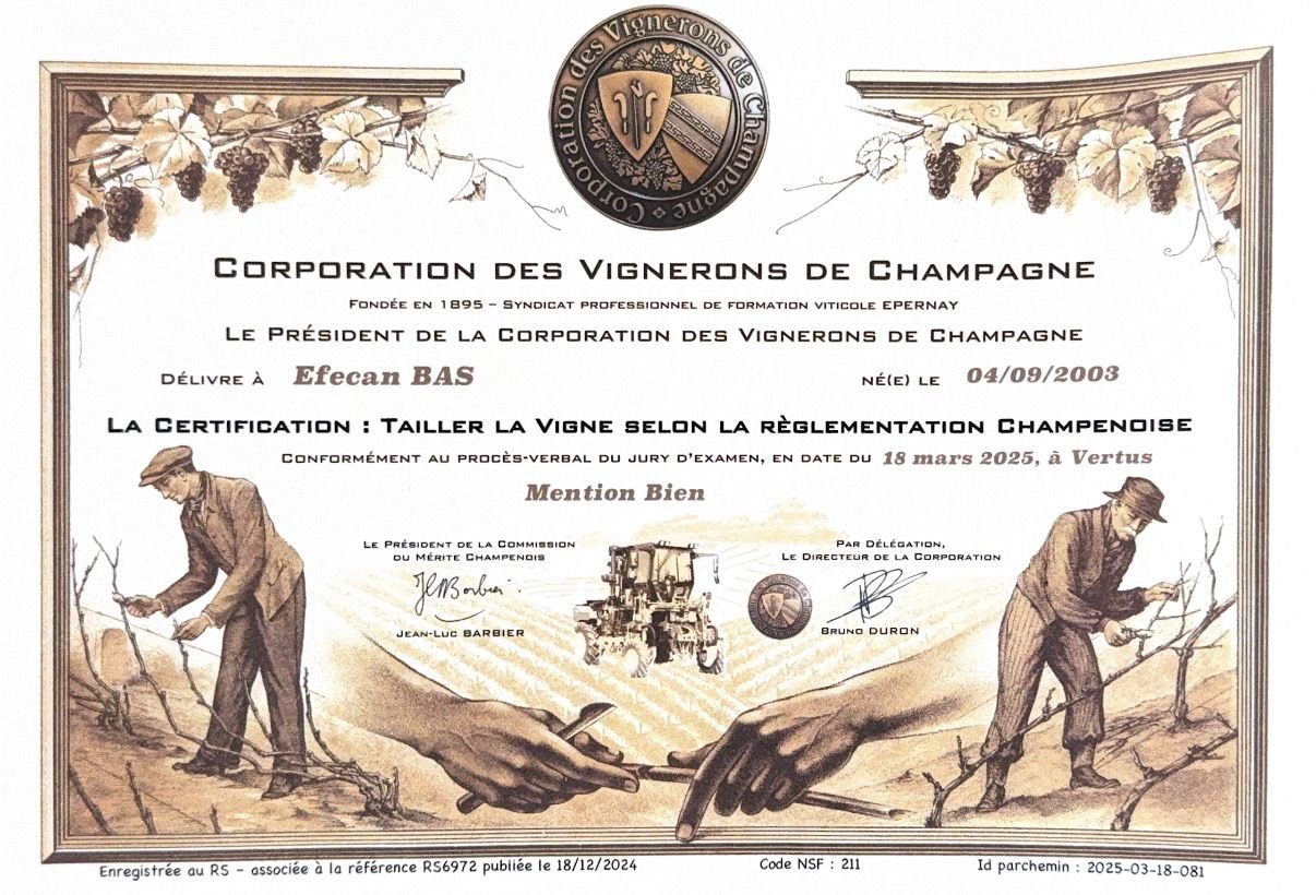 C’est avec une grande fierté que nous annonçons l’obtention du diplôme de la Corporation des Vignerons de Champagne. Plus qu’une simple certification, ce titre vient valider notre maîtrise des gestes techniques et notre profond respect des traditions viticoles de notre région.